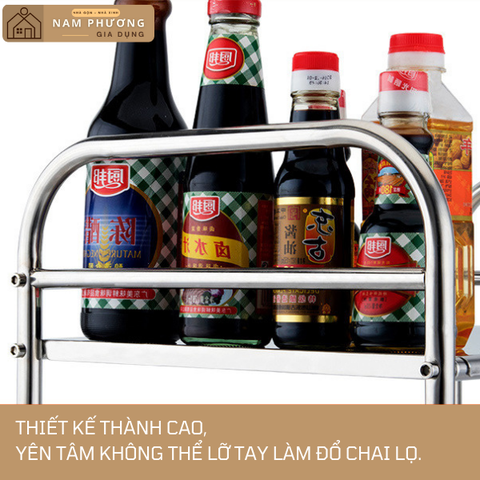 Tầng 2 của kệ bếp được thiết kế thanh chắn cao. Bạn thoải mái đựng các đồ dùng khác, chai lọ, gia vị... không lo bị rơi đổ.